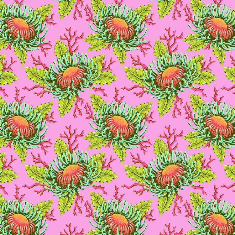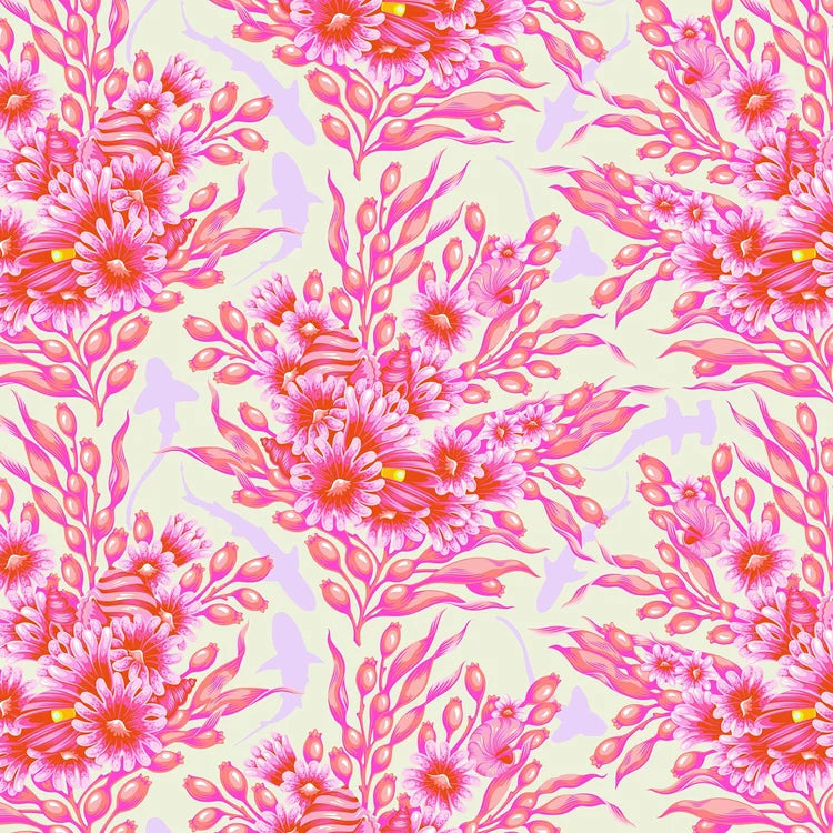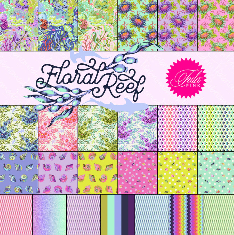 I grew up on the Pacific Coast in Southern California. Even though I now live, landlocked, in the Midwest I always find myself drawn back to salty water. Our world’s oceans are deep and confounding, hiding a million mysteries we have yet to discover. It’s this mystery that keeps me coming back to it again and again. Submerging yourself in the water you find a whole alien planet like ours but different. I wanted to play with that idea. I approached this like a floral collection but instead of the usual land flowers we are so used to I replaced the bouquets with sprigs of coral, anemones and seaweed. Mixed among these water florals are the shadows of sharks, colorful seahorses, tropical fish and kraits with the occasional octopus tentacle for good measure. Take a dip in the deep sea and let the magical underwater world wash over you. If you look close you might even find a pearl or two! - Tula Pink